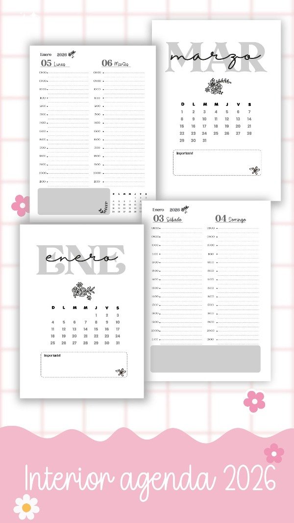 📘 Interior digital – Agenda 2026 - blanco y negro - detalles con flores